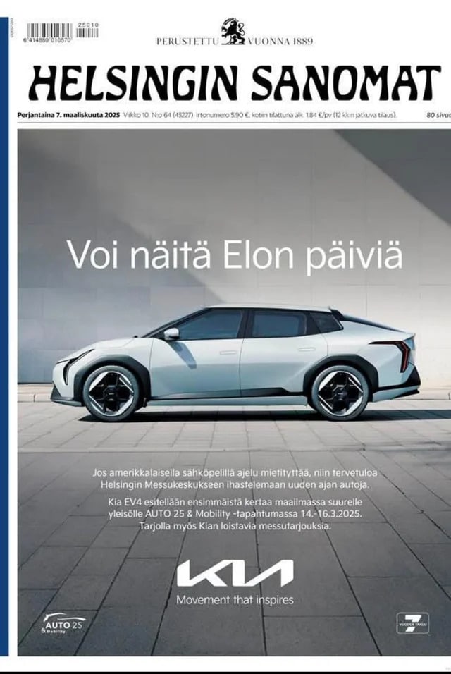 این تبلیغ همچنین توجه مردم فنلاند را به تغییرات سیاسی در آمریکا و تأثیر آن بر خریداران خودروهای آمریکایی جلب کرده و آن‌ ها را دعوت می‌ کند تا در نمایشگاه خودرویی که به‌زودی در هلسینکی برگزار می‌ شود، مدل جدید کیا EV4 را ببینند.