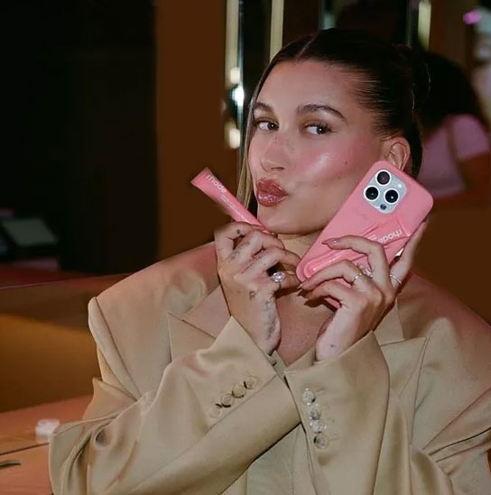 در عکس استوری، ناخن های بادامی شکل او با سایه قهوه ای رنگ آمیزی رنگشده و دارای پودر کروم است تا جلوه لعاب دار بیبر را به آن ببخشد. زولا گانزوریگت، هنرمند قدیمی ناخن بیبر، این مانیکور را ساخت.